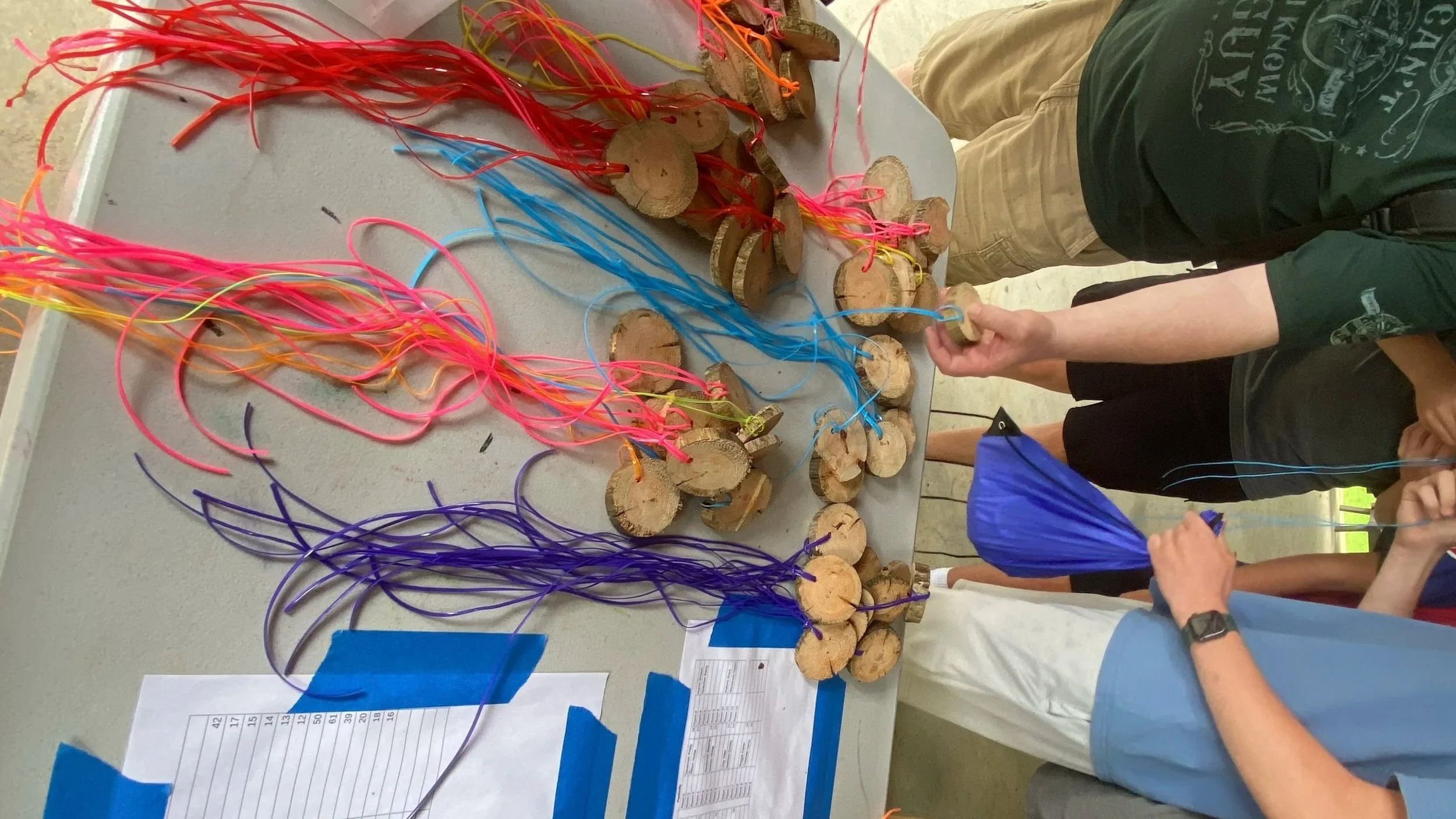 Camper nametags are cut from local tree branches. For many years Bill Joy would make these blanks for use in our camps. He developed a jig where he could produce many at a time.