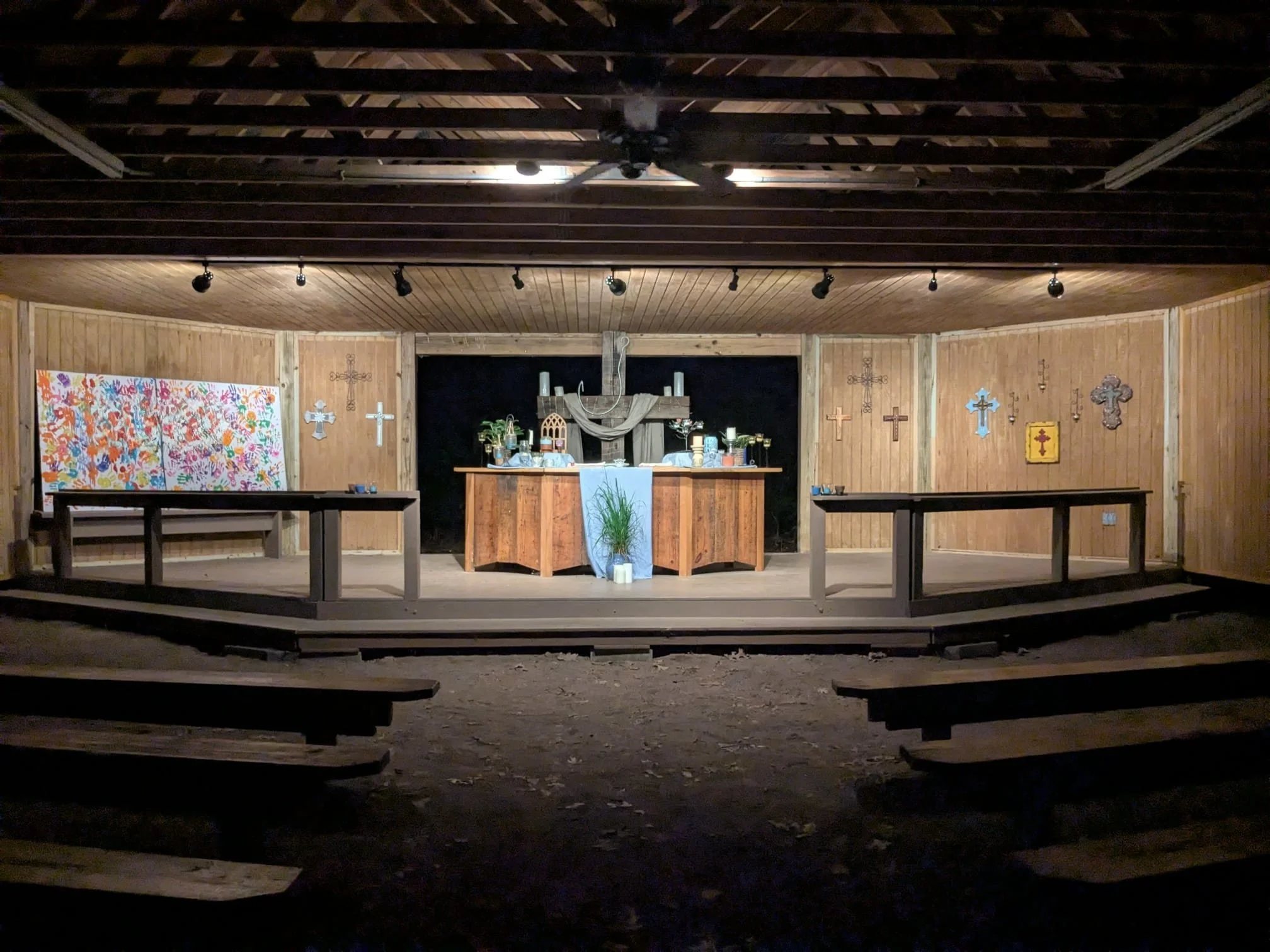 Located at the front of camp, this covered space is perfect for worship. The worship center can seat up to 165 on the wooden benches.